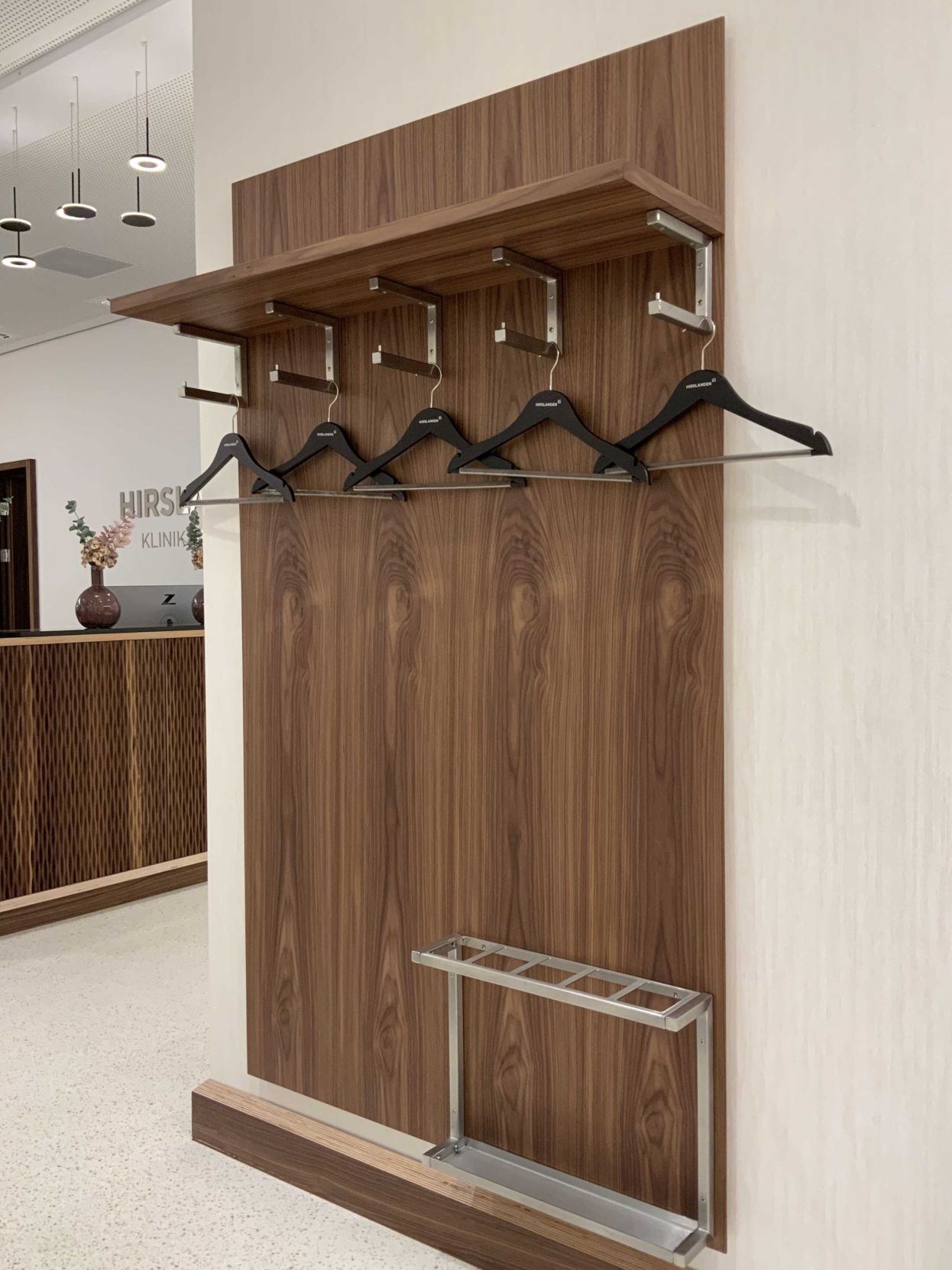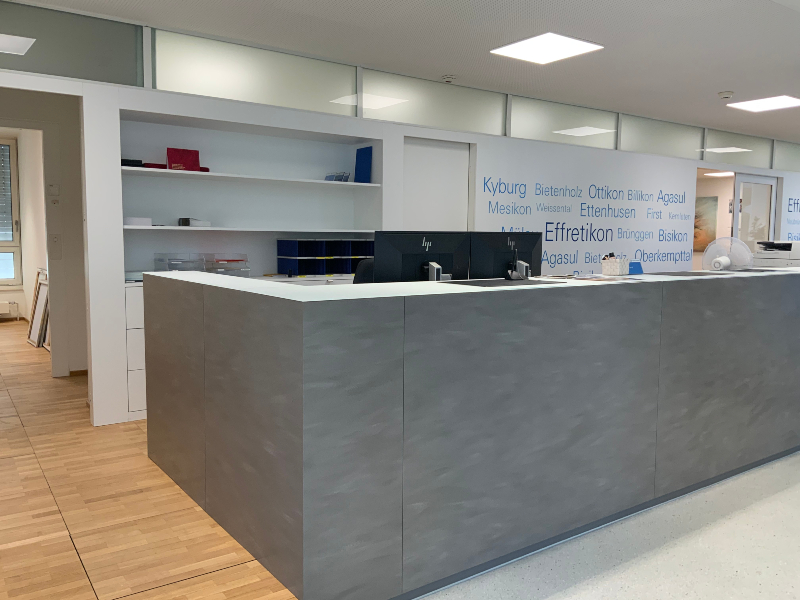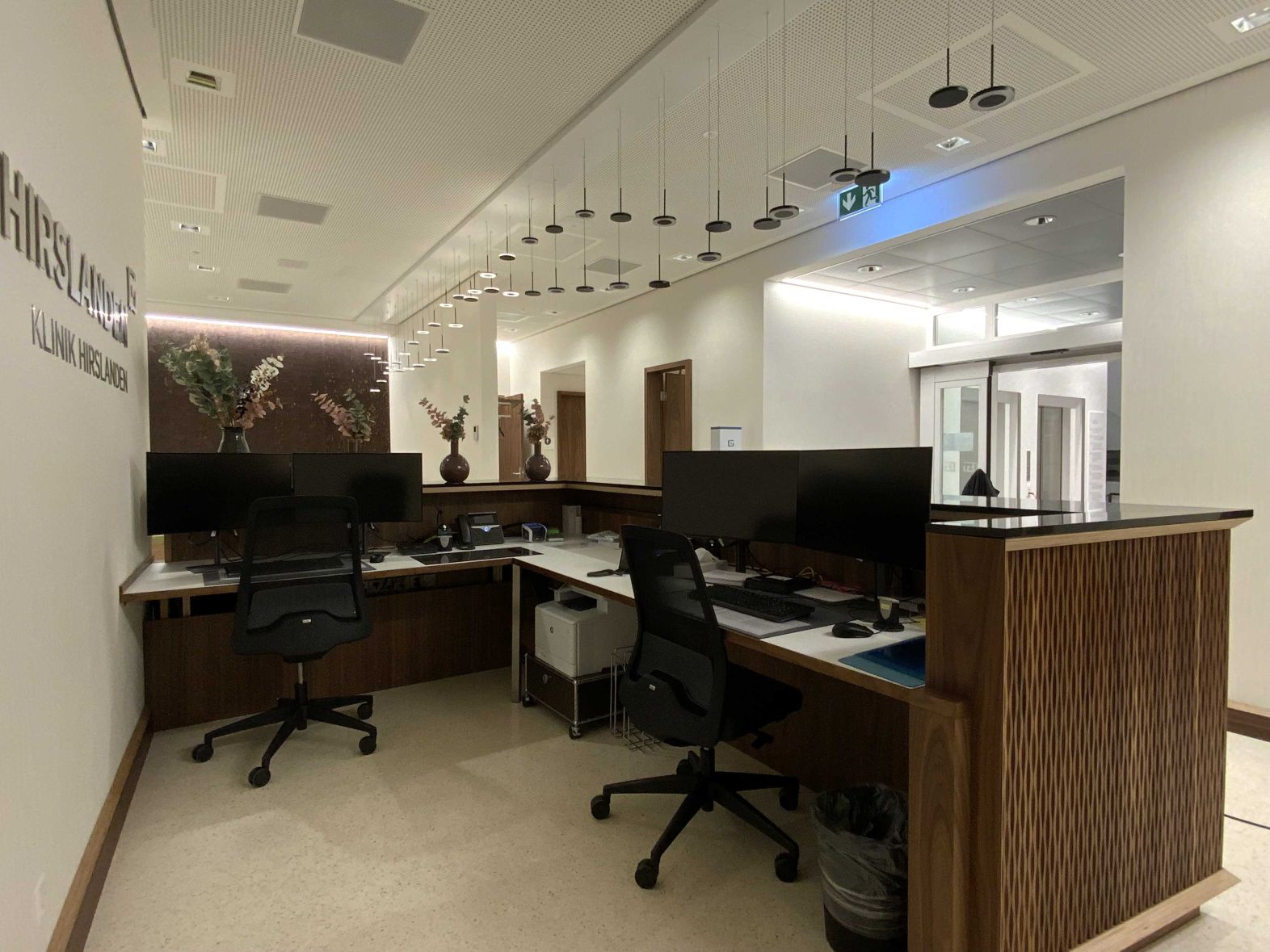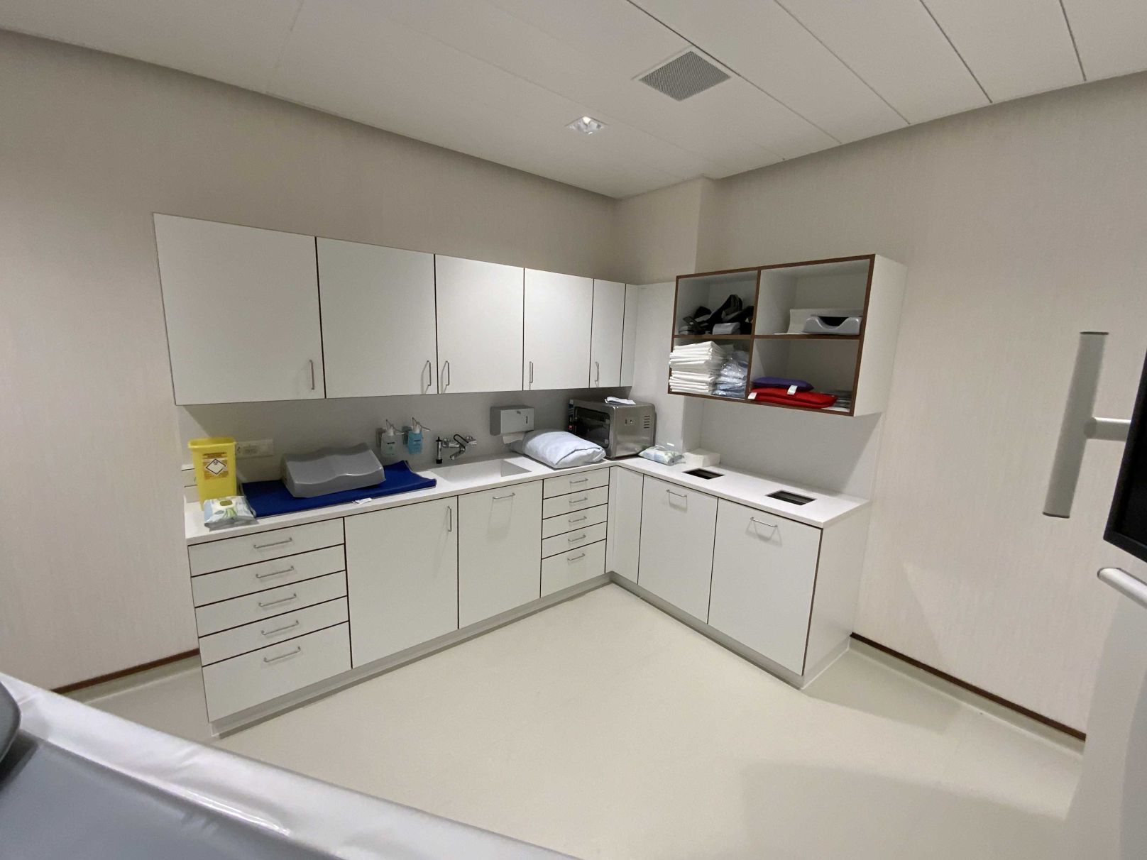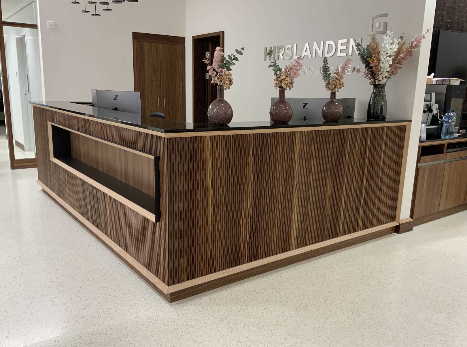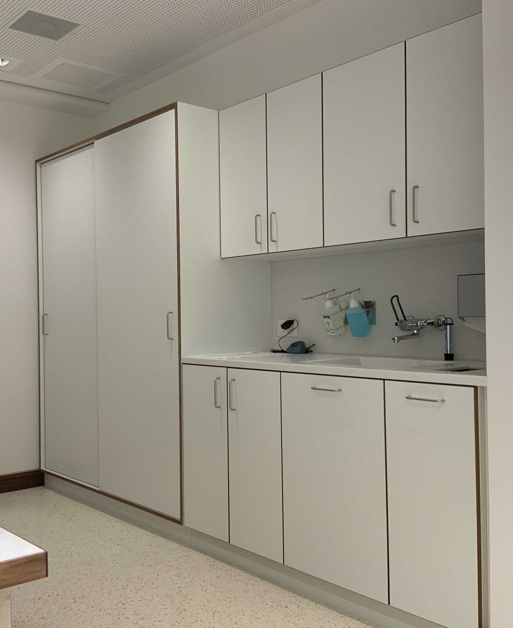 gesamter Praxisausbau in hochwertigem Nussbaum kombiniert mit weissen Möbeloberflächen