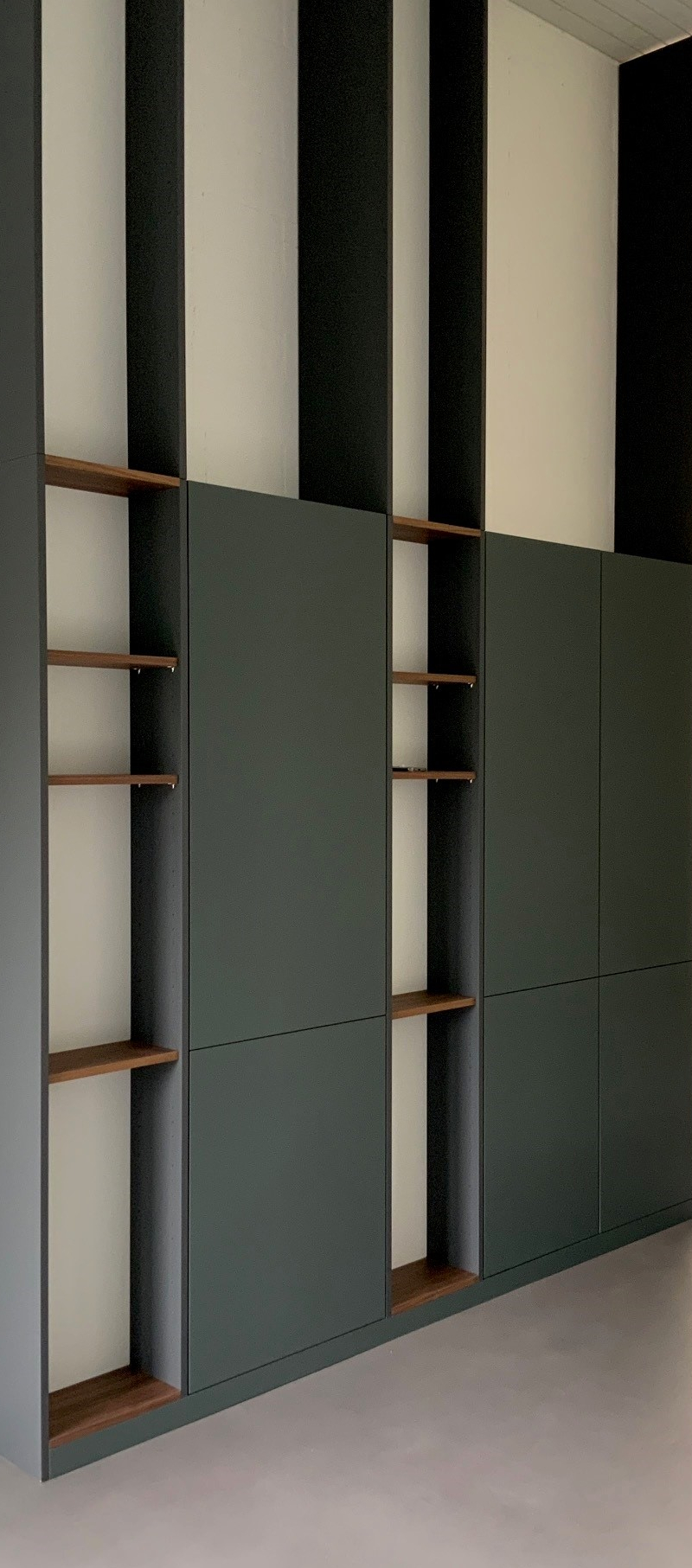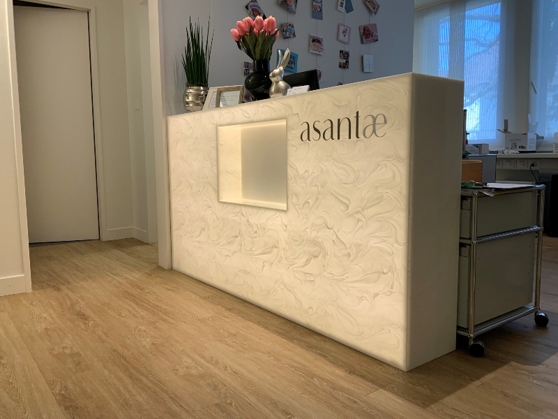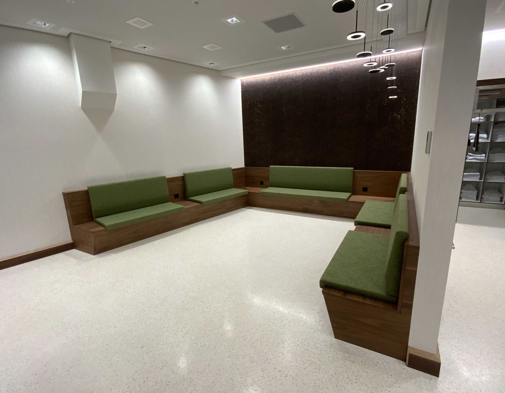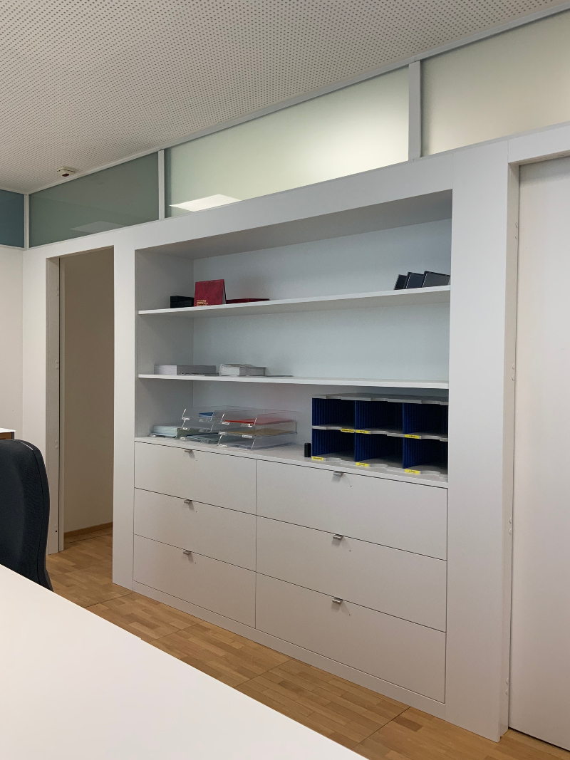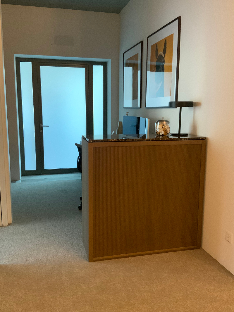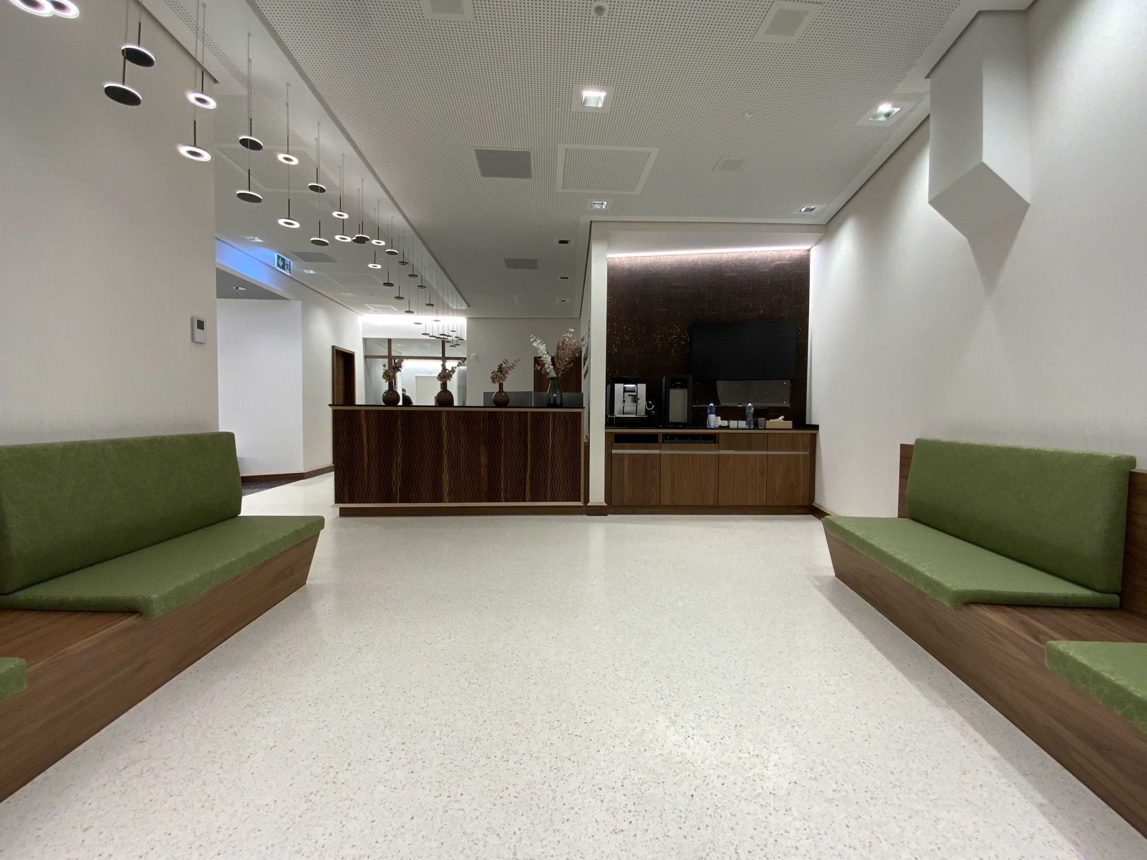gesamter Praxisausbau in hochwertigem Nussbaum kombiniert mit weissen Möbeloberflächen