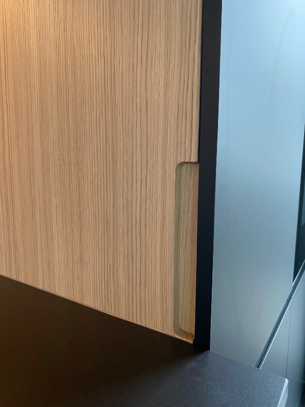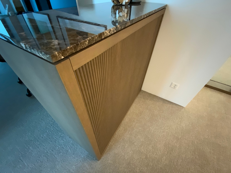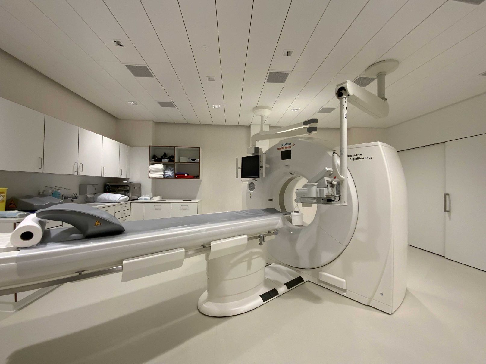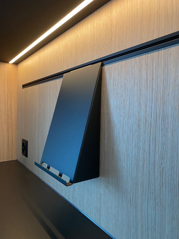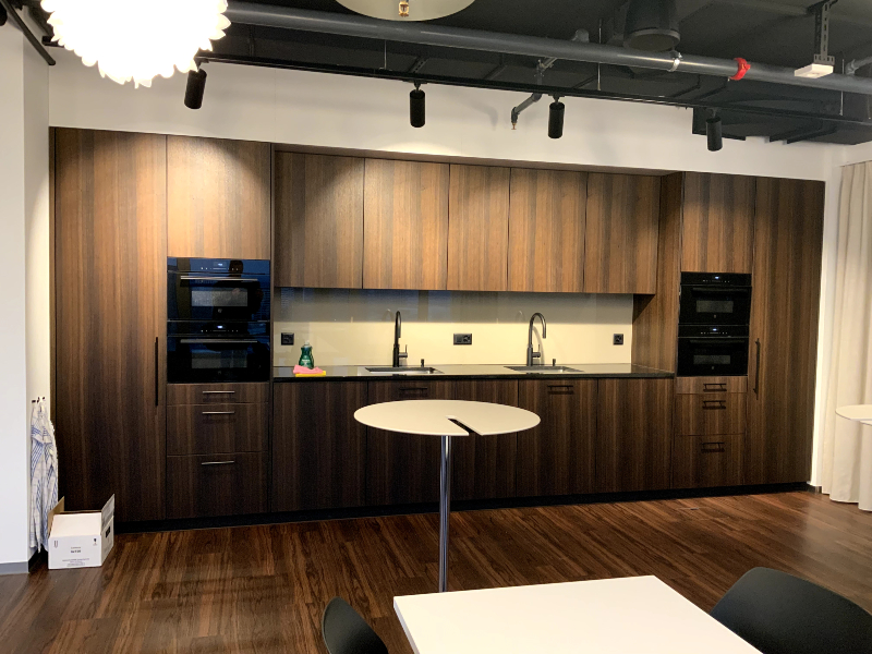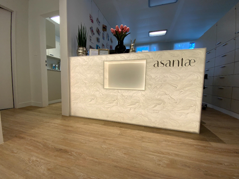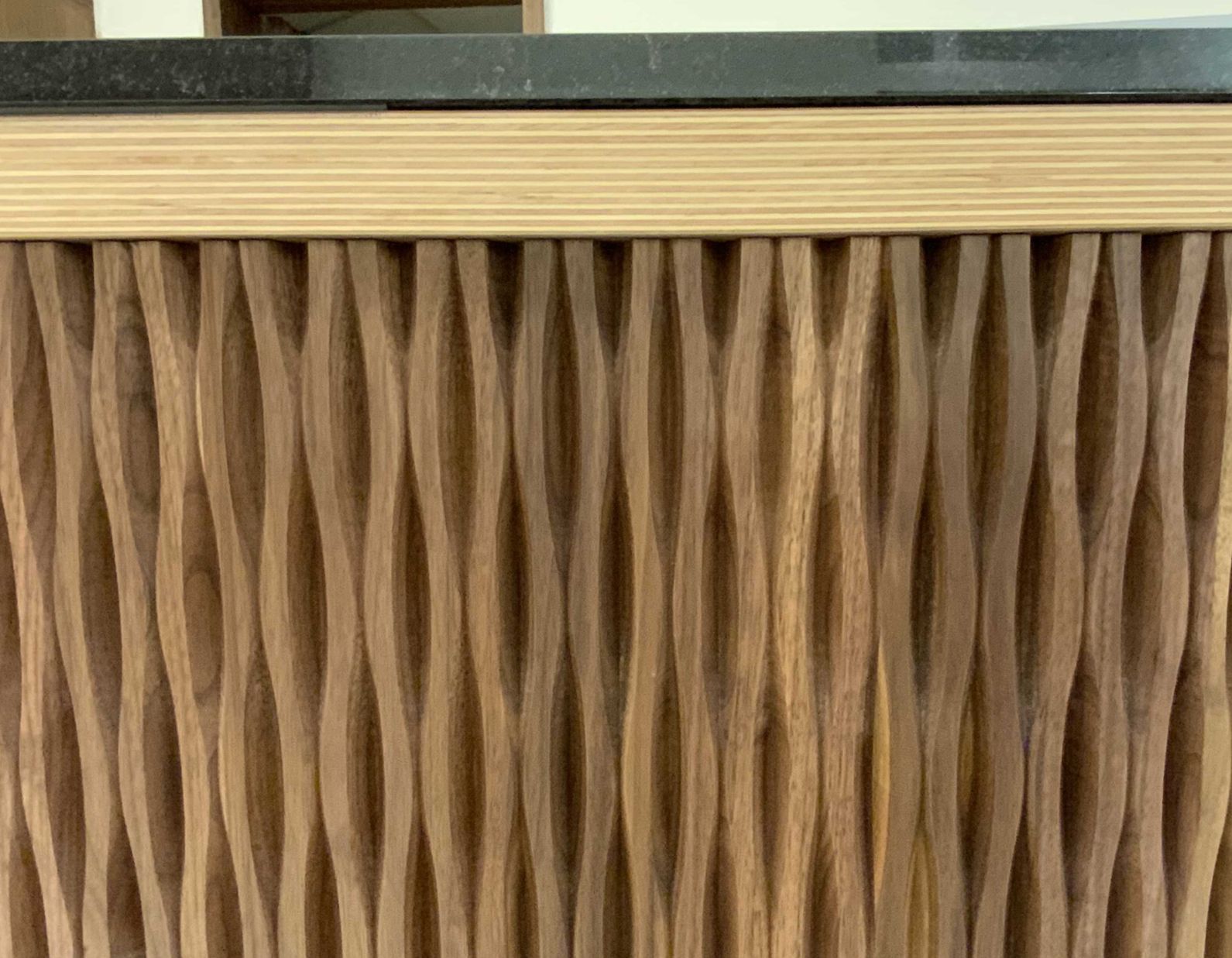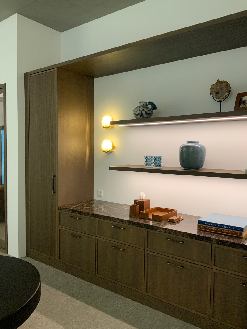 gesamter Praxisausbau in hochwertigem Nussbaum kombiniert mit weissen Möbeloberflächen
